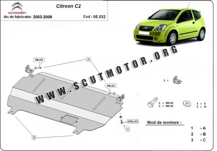 Scutul este nouă și se potrivește perfect pentru toate tipurile de motorizare Citroen C2 fabricat între ani 2003 - 2009.