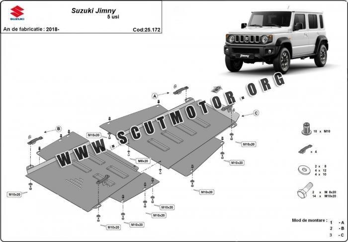 Scutul este nouă și se potrivește perfect pentru toate tipurile de motorizare Suzuki Jimny fabricat între ani 2018 - 2025.